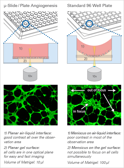 Further, no gel meniscus is formed. This ensures the formation of a uniformly thick gel matrix on which all cells are in one optical plane, creating reproducible cell culture conditions. The μ-Plate Angiogenesis can be used with all common hydrogel matrices, such as Matrigel?, collagen gels, agarose gels, and hyaluronic acid gels.