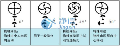 三次元旋振篩,由直立式電機作激振源,電機上端安裝偏心重錘(基準塊),下端安裝可調(diào)節(jié)偏心塊,如下圖所示,當兩側偏心塊向中間合攏,振幅變??;當偏心塊向兩側分離,振幅變大。通過調(diào)節(jié)偏心塊的位置將電機的旋轉運動轉變?yōu)樗健⒋怪?、傾斜的三次元運動,通過調(diào)整下端兩偏心塊的夾角大小來控制振幅,把這個運動傳遞給篩面調(diào)節(jié)下端偏心塊的相位角,可以改變物料在篩面上的運動軌跡。