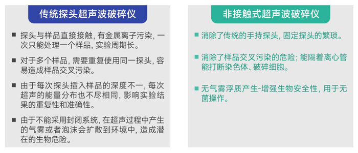 非接觸式樣品可在密閉容器下進(jìn)行破碎,不產(chǎn)生感染性飛霧,超聲探頭與樣品不接觸,避免交叉污染。對(duì)于每天要處理多個(gè)樣品或者貴重樣品的實(shí)驗(yàn)室,非接觸超聲波DNA破碎儀具有處理高通量,樣本低損耗無交叉污染等優(yōu)勢(shì)。逐漸成為ChIP(染色質(zhì)免疫共沉淀)和DNA剪切研究平臺(tái)不可缺少的標(biāo)準(zhǔn)化工具。