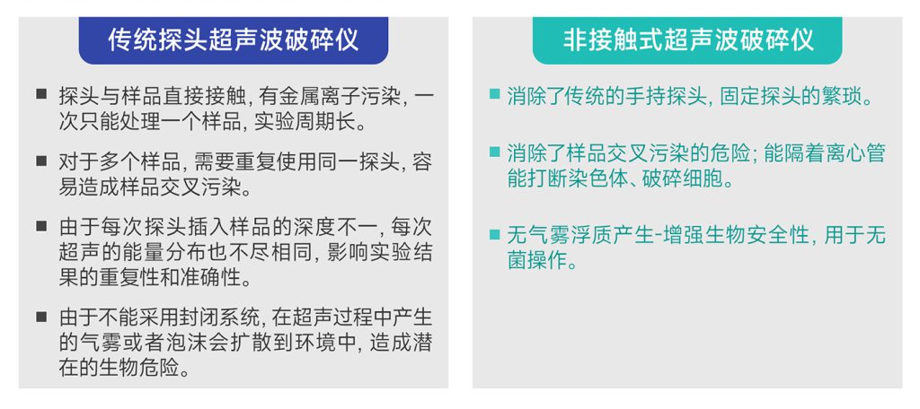 采用超聲波磁致伸縮的原理,把超聲波波形聚焦在液體中,使超聲波能量有質(zhì)的轉(zhuǎn)變。傳統(tǒng)的探頭超聲波破碎儀,探頭與樣品直接接觸,一次只能處理一個(gè)樣品,實(shí)驗(yàn)周期長;對于多個(gè)樣品,需要重復(fù)使用同一探頭,容易造成樣品交叉污染。由于每次探頭插入樣品的深度不同,每次超聲的能量分布也不盡相同,影響實(shí)驗(yàn)結(jié)果的重復(fù)性和準(zhǔn)確性。此外,由于不能采用封閉系統(tǒng),在超聲過程中產(chǎn)生的氣霧或者泡沫會擴(kuò)散到環(huán)境中,造成潛在的生物危險(xiǎn)。